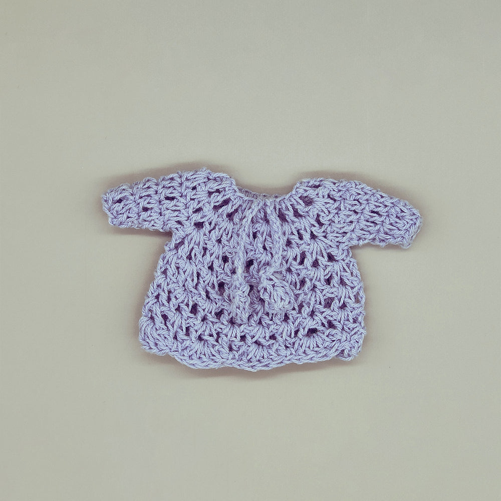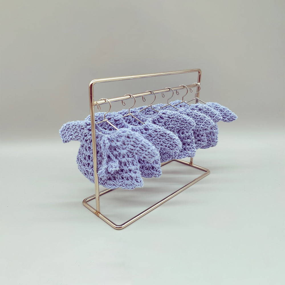 Choose your preferred option: ● Set of 6 Mini Sweaters: Includes six baby blue mini crochet sweaters. ● Set of 6 with Mini Hangers: Includes six baby blue mini sweaters and six cute silver mini hangers. ● Full Set with Hanging Rack: Includes six baby blue mini sweaters, six silver mini hangers, and one adorable silver mini hanging rack.
