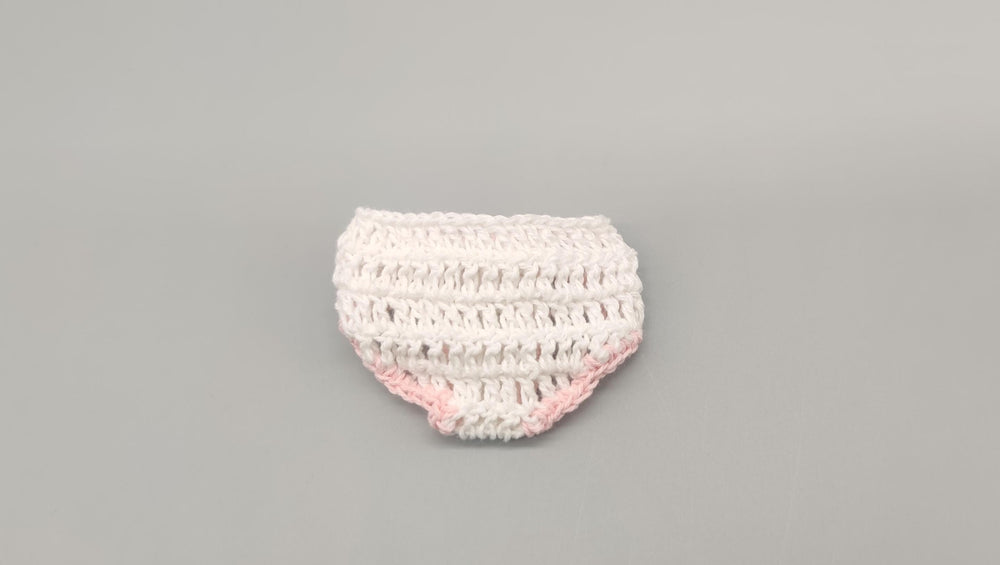 Knit/Crochet Baby Pink Baby with White Diapers with baby pink flower, perfect for any baby occasion. Great for baby showers or baby welcome parties to insert a covered chocolate inside or get creative.