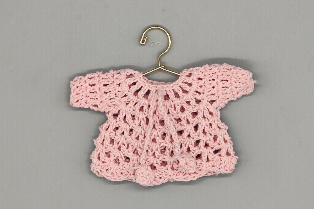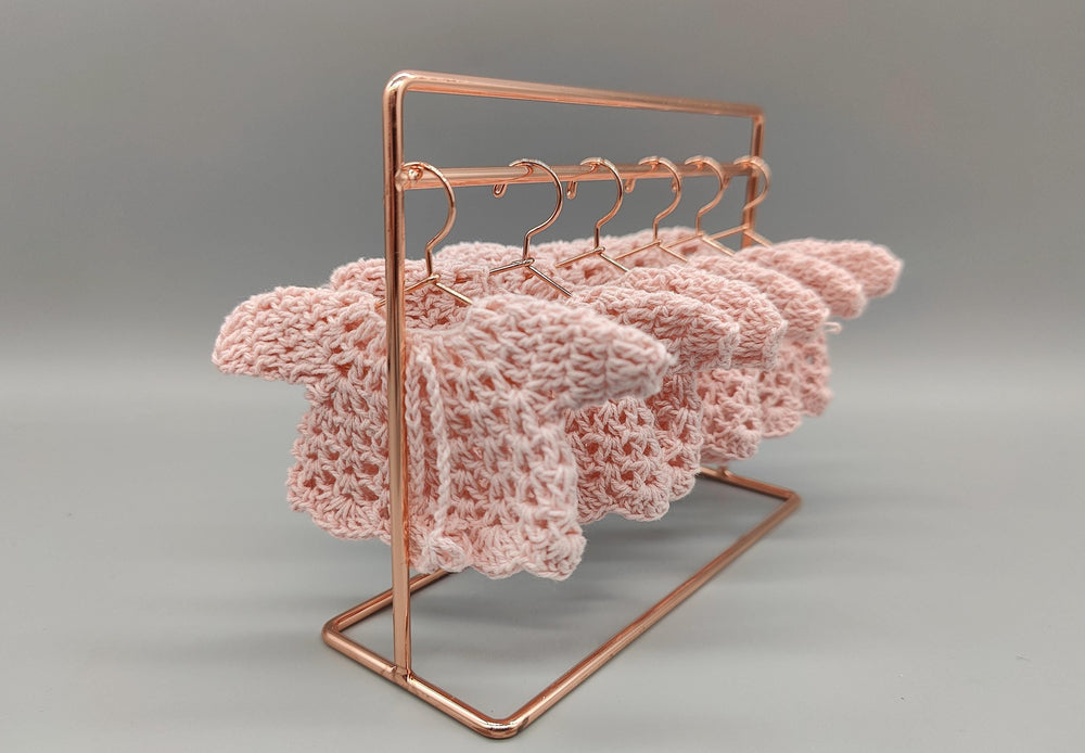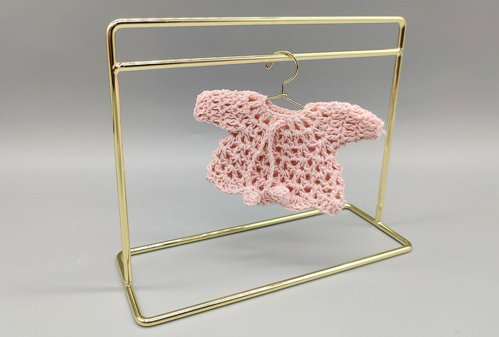 Choose your preferred option: ● Set of 6 Mini Sweaters: Includes six mini crochet sweaters. ● Set of 6 with Mini Hangers: Includes six mini sweaters and six cute mini hangers.(available in gold, silver or rose gold). ● Full Set with Hanging Rack: Includes six mini sweaters, six mini hangers, and one adorable mini hanging rack (available in gold, silver or rose gold).