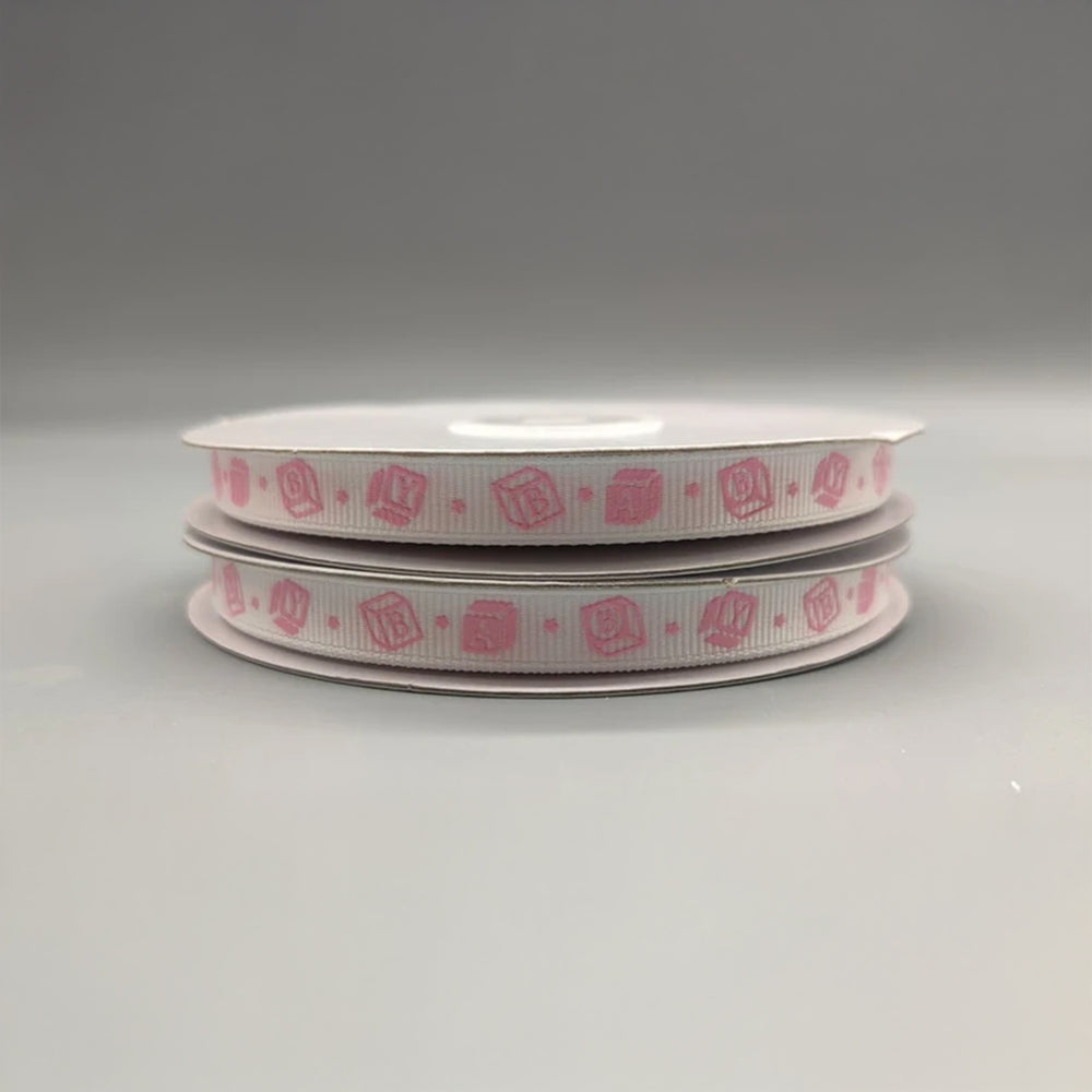 Very cute and unique baby girl ribbons in white with a baby pink ABC blocks pattern. Each roll is approx 3/8 in thick and a generous 25 yards long. Has a classic grosgrain texture.