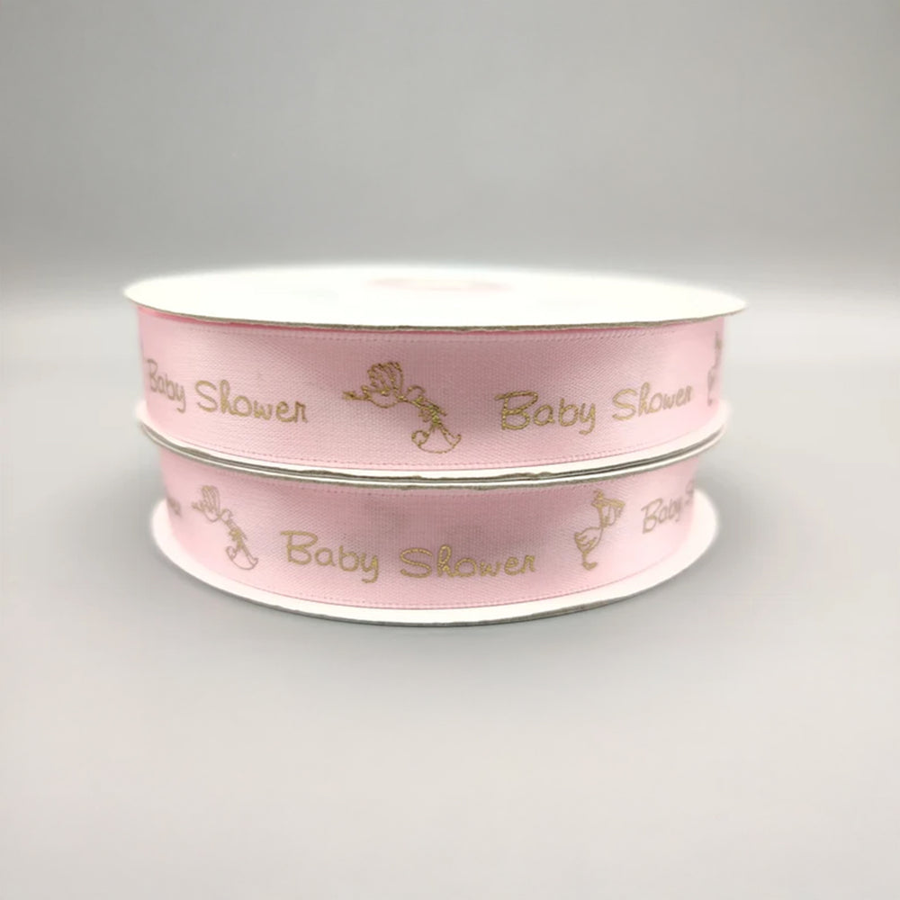 Baby Shower Ribbon - Baby Blue or Baby Pink Ribbon - Stork Ribbon - 25 Yards X 5/8" - 100% Polyester Very cute and unique baby shower ribbons in baby girl or baby boy. Each roll is approx 5/8 in thick and a generous 25 yards long. Each ribbon is continuously gold embossed with the words "Baby Shower" and a stork.