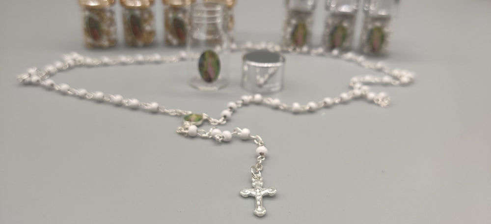 Baptism Favor - White Beaded Rosary Necklace Crucifix in elegant Glass bottle Set of 12 - Choice of Gold or Silver - Recuerdos de Bautizo