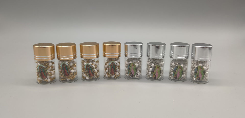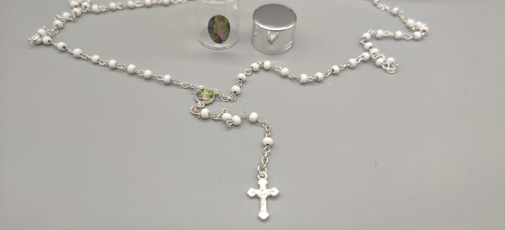 Choice of 2 colors: White beaded rosary with gold colored chain and crucifix and gold capped glass bottle OR White beaded rosary with silver colored chain and crucifix and silver capped glass bottle