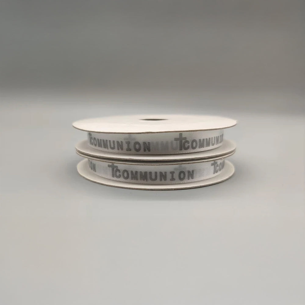 Communion Ribbon with Holy Cross - Silver Embossed for 1st Communion - 10 Yards x 3/8" - 100% Polyester Very cute and unique communion ribbons. Repeating image of Holy Cross and "Communion" along the entire ribbon. Each roll is approx 3/8 in thick and a generous 10 yards long.