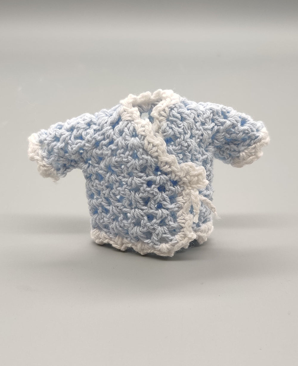 Our crochet mini baby jacket favors are great to use as is or you can put a small piece of candy in it from the bottom. Perfect for baby shower or baby welcome parties. Each jacket is baby blue with white trim and so cute.