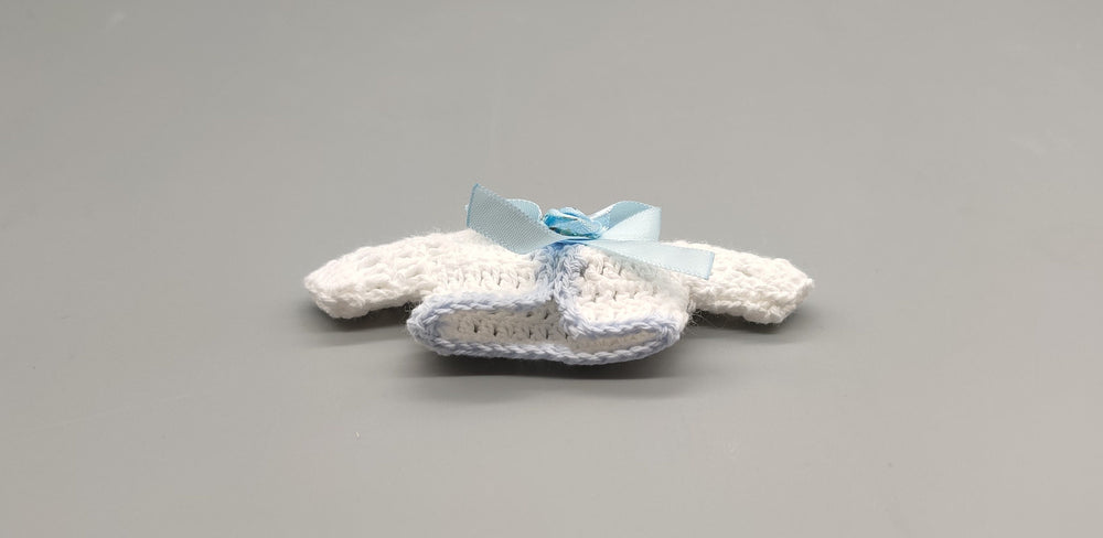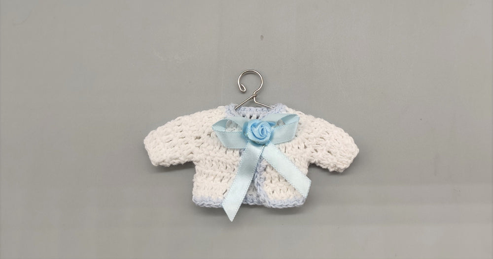 Crochet mini jacket, white with baby blue accent bow, cute favors, baby shower, baby welcome, crochet favors, baby shower favours, Set of 6