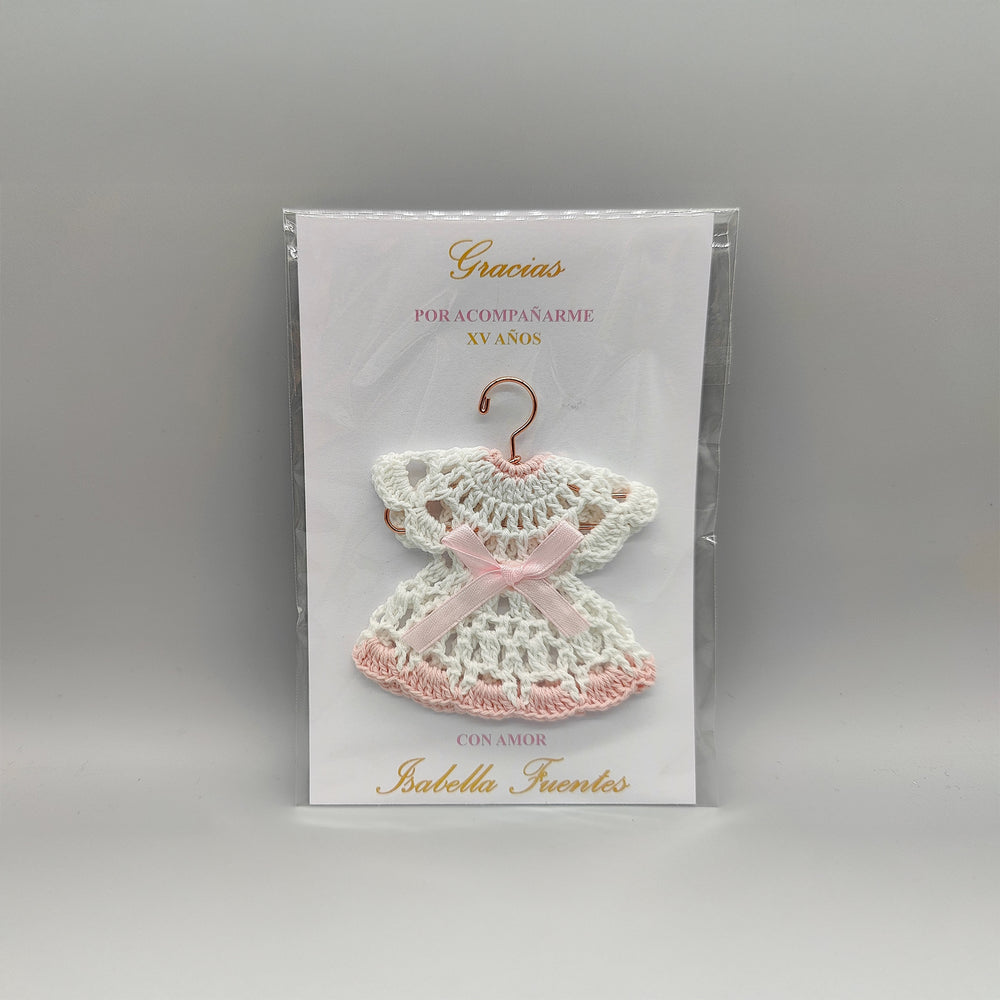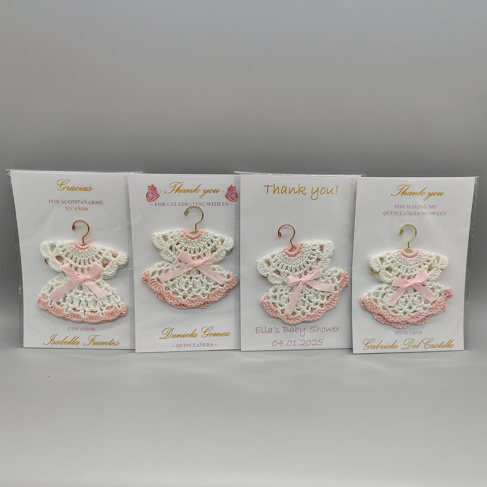 The Quinceanera / Mis 15 Anos / Baby Shower party favors are cute and chic. You get a set of 6 favors. Each favor consists of a cute white with pink accent crochet dress with a cute pink bow and hanger with Gold or Rose Gold. Packaged inside a clear and sealed 4x6 celo bag with personalized heavy stock card.