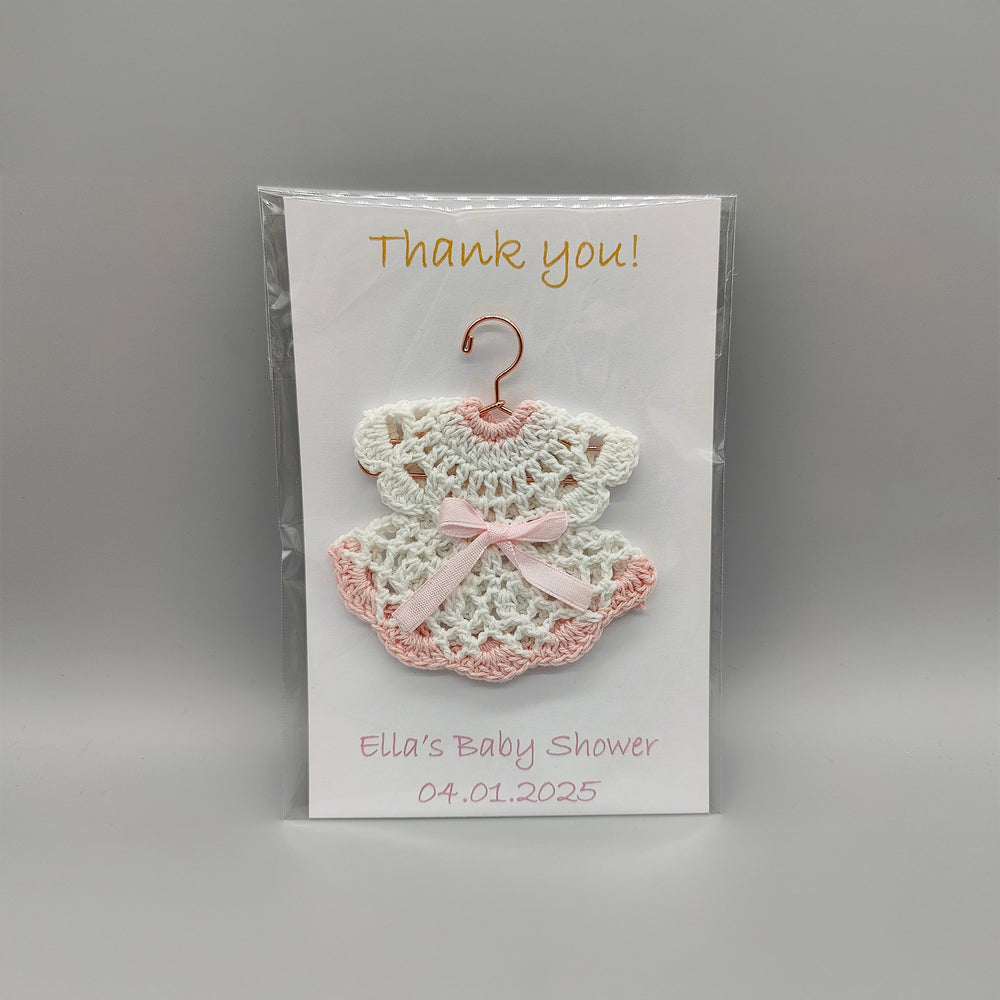 Customized crochet favor dress with pink bow and hanger. Personalized card and dress for Quinceanera or baby shower. FREE SHIPPING! Set of 6