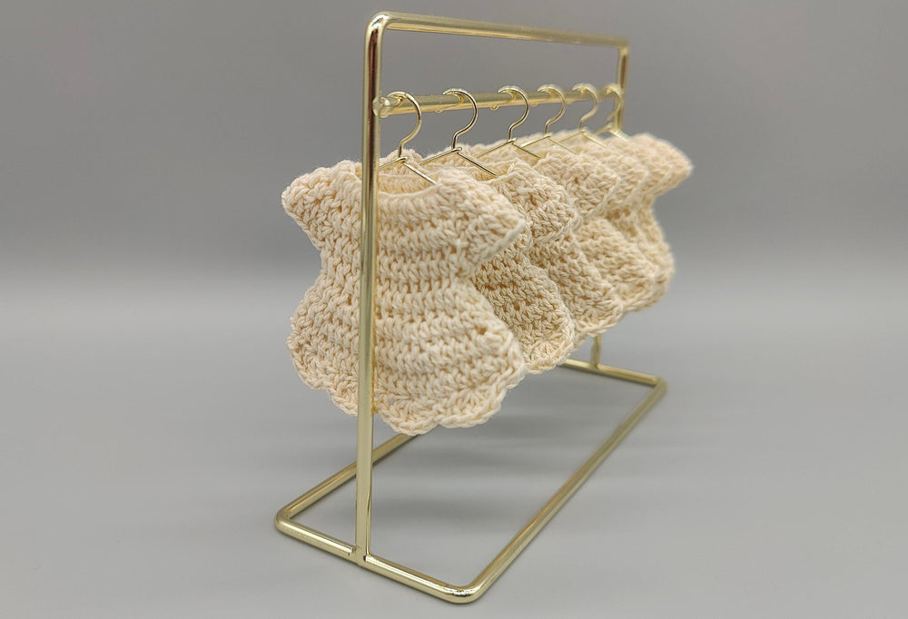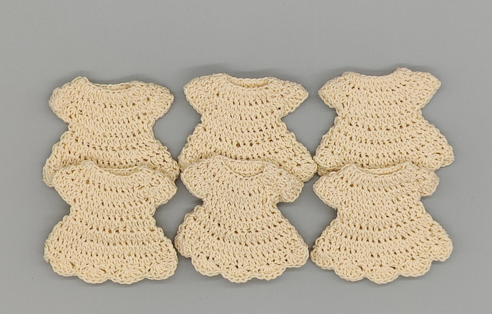 Product Details 💛 Set of 6 mini crochet dresses 💛 Color: Beautiful Cream 💛 Dimensions: Each dress is approximately 2 inches tall and 2.5 inches wide at the bottom.