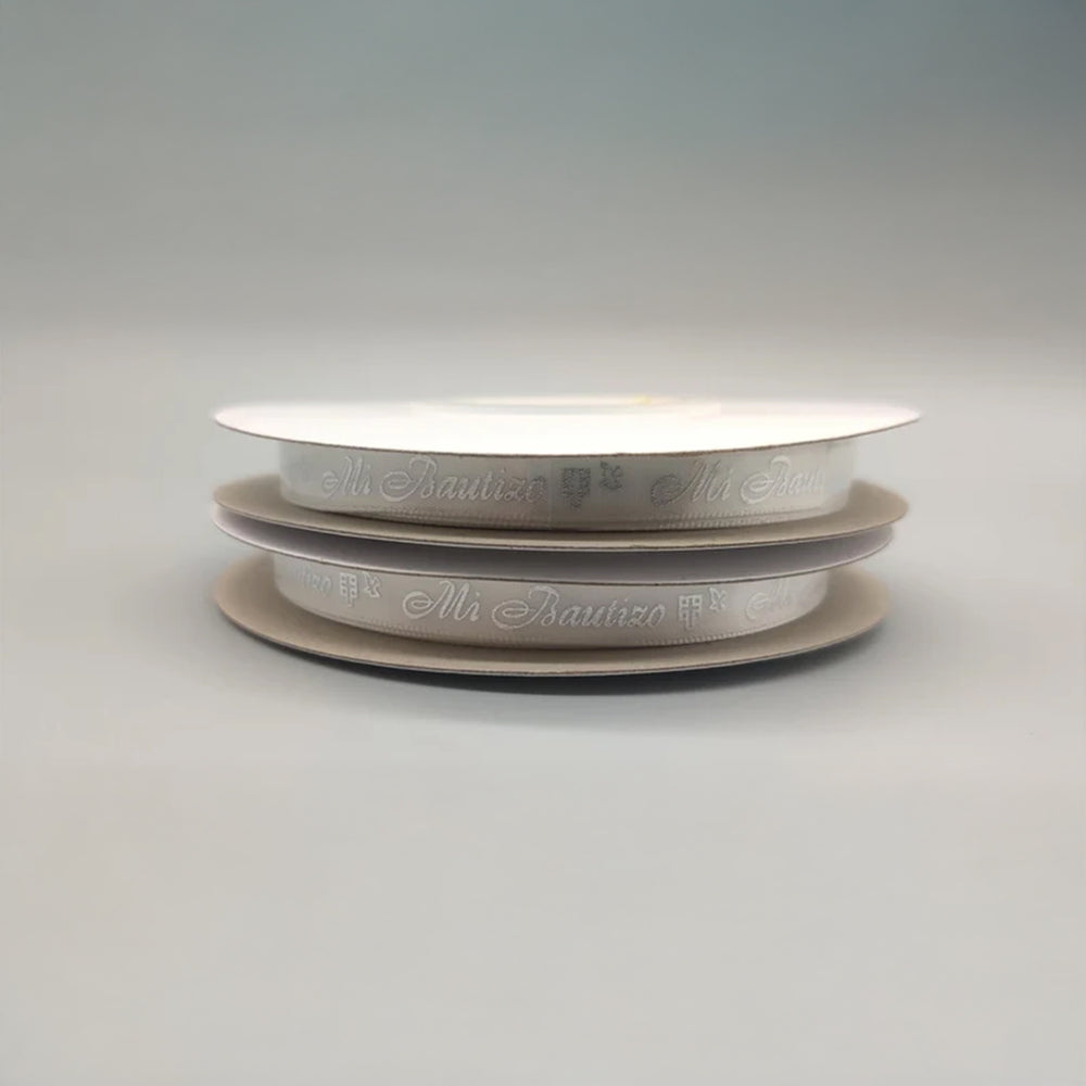 Mi Bautizo Ribbon with Holy Cross & Dove Pattern - White Ribbon - Silver Embossed - 25 Yards x 3/8" - 100% Polyester - In Spanish Very cute lace-like and unique baptism ribbons. "Mi Bautizo" (Spanish) with repeating Holy Cross pattern and dove pattern. Each roll is approx 3/8 in thick and a generous 25 yards long.