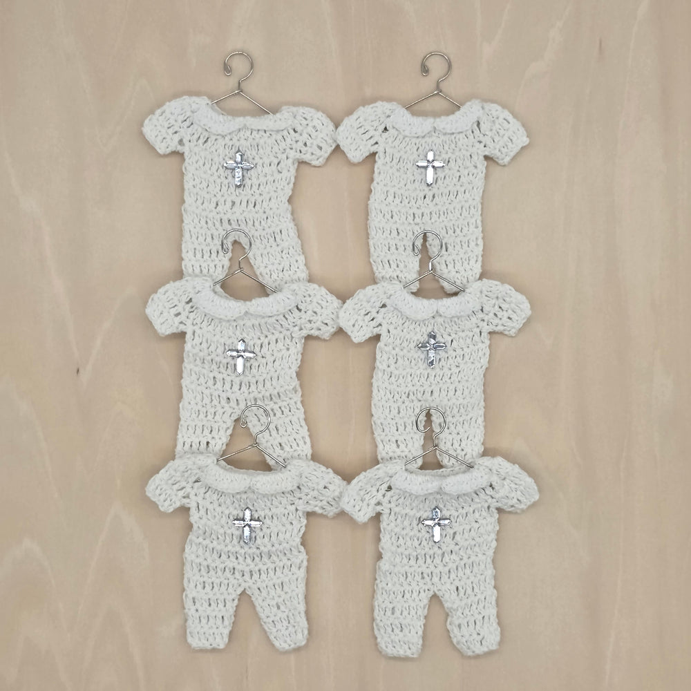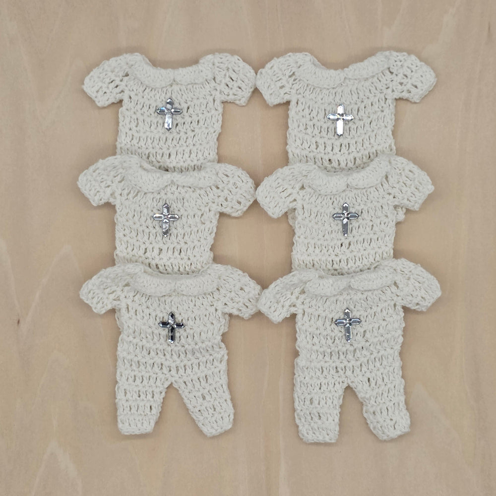 Mini Crochet Baptism Favors - White Onesie with Silver Cross & Hanger Options | Christening, Baby Shower, First Communion Decor - 6 pieces
