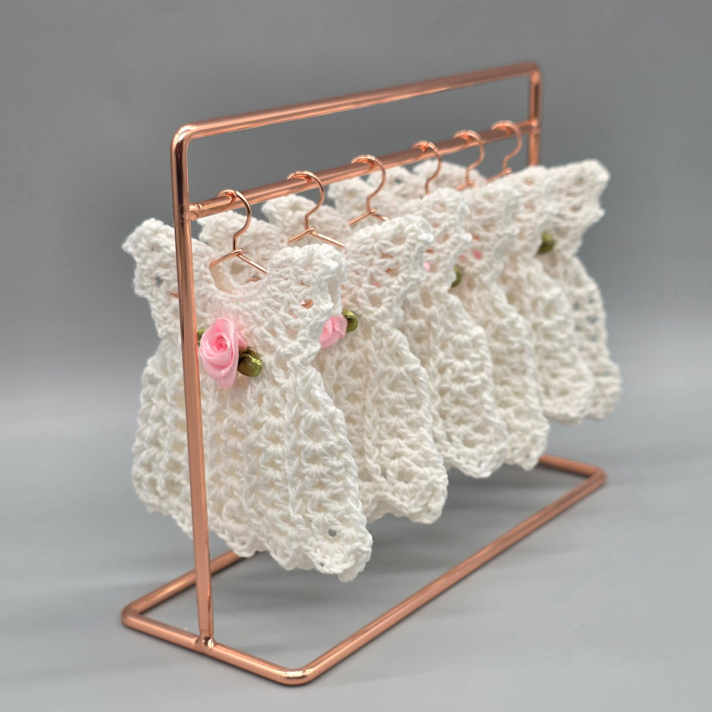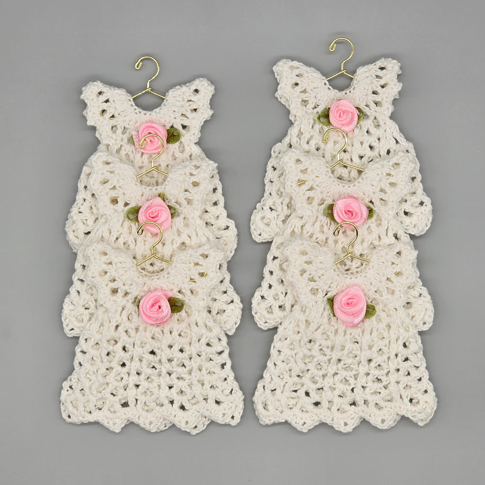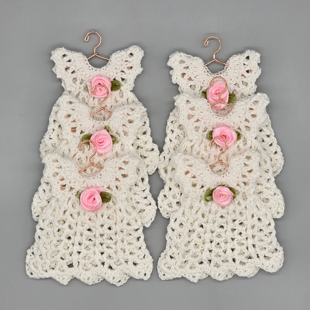 Welcome guests with the sweetest keepsake! This set of six adorable mini crochet dresses is the perfect favor, decoration, or gift for your special events. Each tiny dress is lovingly hand-crocheted in soft white yarn with a delicate lace stitch pattern and adorned with a charming pink satin rose and green leaf accent.