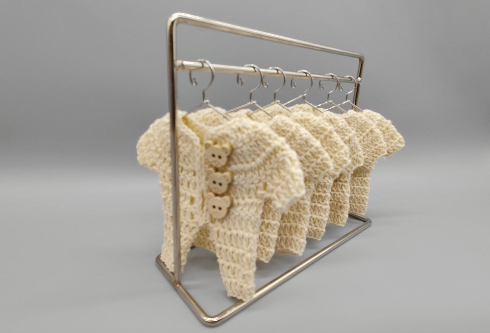 ● Onesie Only: The beautiful crochet onesie as-is, perfect for adding to gift bags or table settings. ● Onesie with Mini Hanger: Each onesie comes with a cute silver mini hanger so you can display them upright or hang them on a string. ● Onesie with Mini Hanger and Hanging Rack: Create a charming display with a mini hanger and a hanging rack for each onesie. This option is great for setting up a tiny clothesline for your guests to take their favors from.