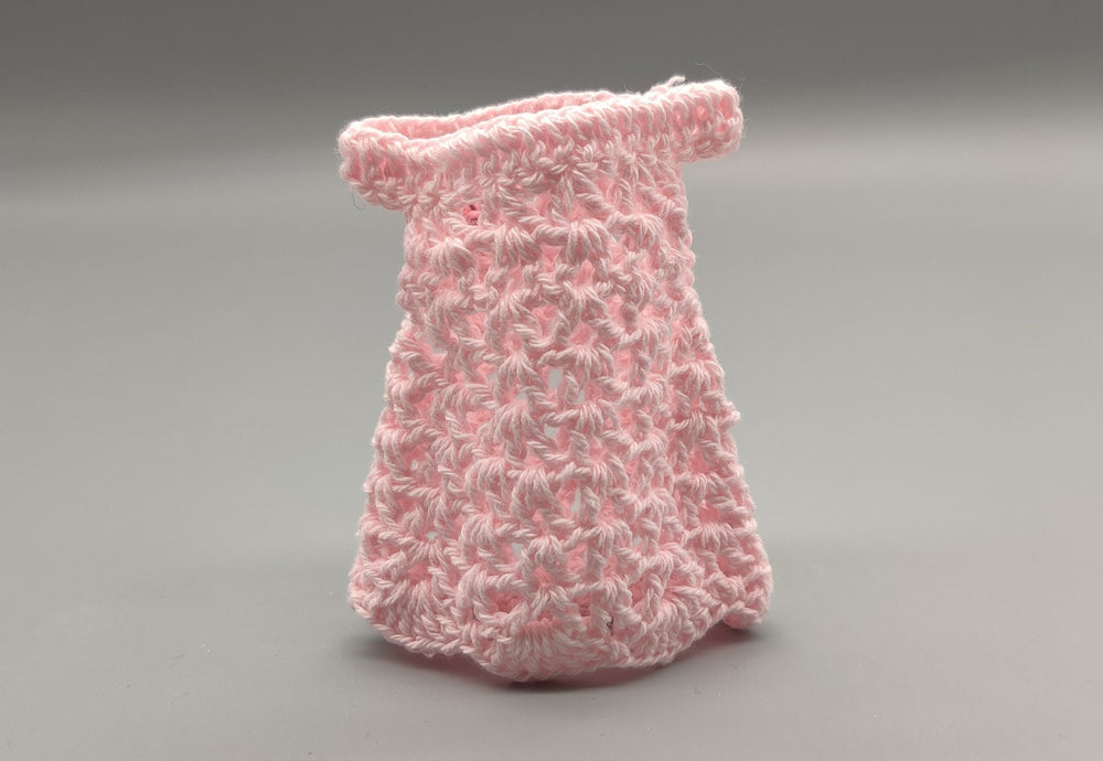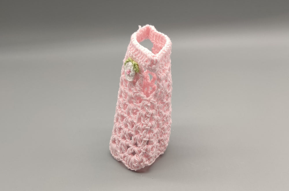 Our baby pink crochet mini dress is perfect for any baby occasion, quinceanera or communion party. A cute pink dress with white flower accent at the left side of the chest. Dress opening from bottom allows for you to place a piece of chocolate or candy inside, as a favor.