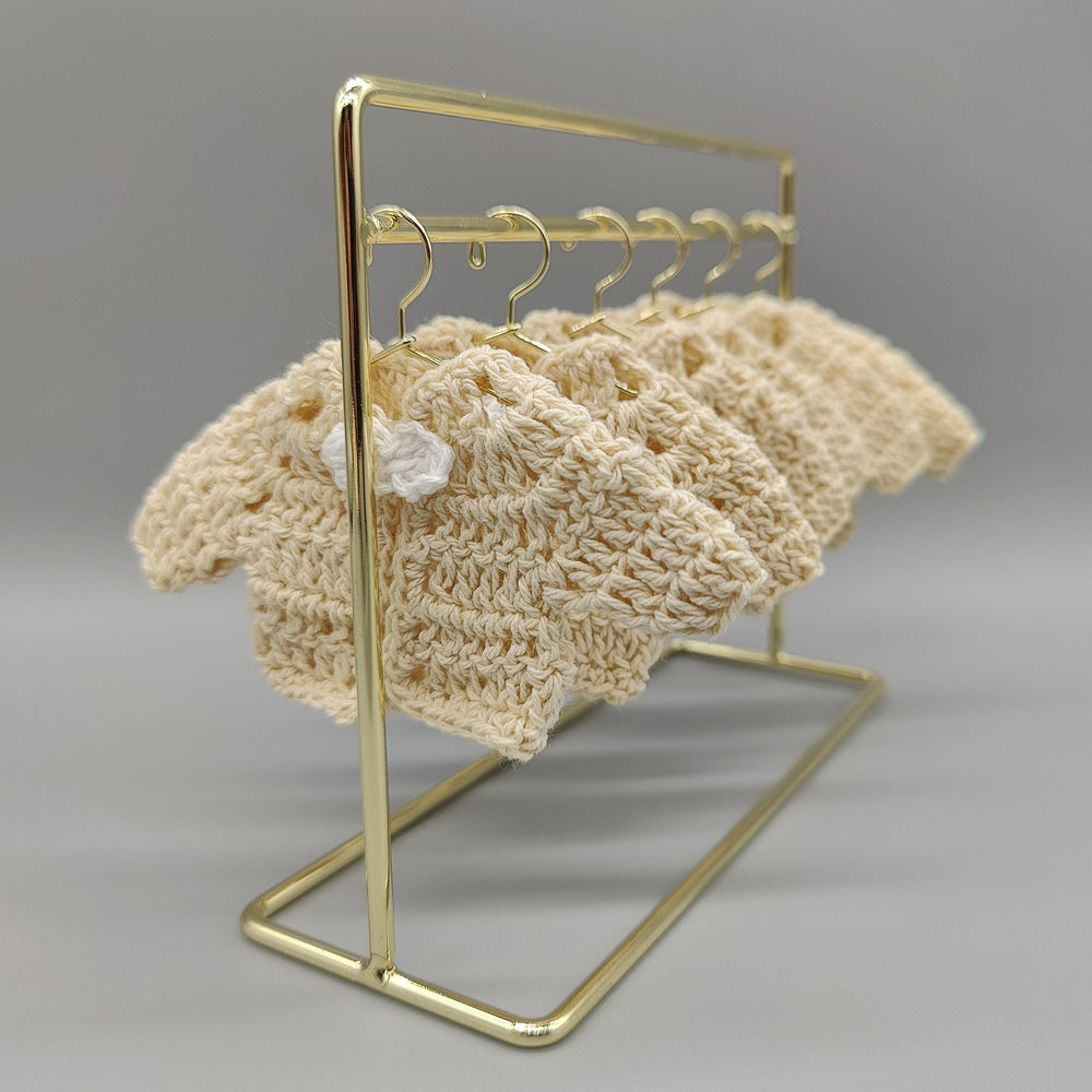 💙Jackets Only: A set of 6 mini crochet baby jackets, ready for you to display or add to your own favor bags. 💙Jackets with Mini-Hangers: A set of 6 jackets, each with its own mini gold-colored hanger. This option is great for displaying on a line. 💙Jackets with Mini-Hangers and a Rack: The ultimate set! You get 6 jackets, 6 mini hangers, and a miniature gold-colored hanging rack to beautifully display all the favors for your guests to see and take.