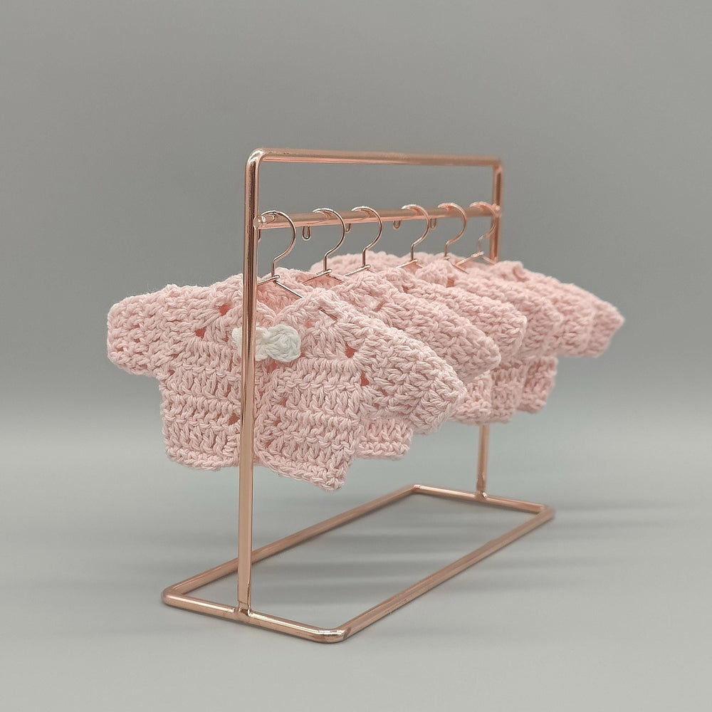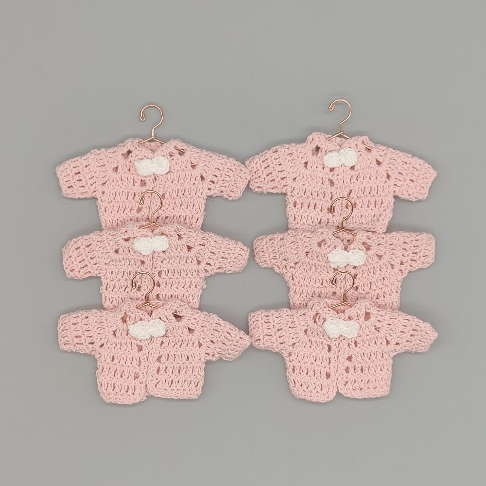 Choose the option that best suits your event: 🌸Set of 6 Mini Jackets: A sweet and simple set of six mini crochet jackets, ready to add a touch of handmade charm to your event decor or gift bags. 🌸Set of 6 with Rose Gold Mini Hangers: Elevate your favors! Each of the six adorable jackets comes with its own miniature rose gold hanger, making them perfect for display as unique keepsakes. ✨ 🌸Set of 6 with Hangers & Hanging Rack: Create a stunning display! You'll receive six mini crochet jackets, each on a rose gold hanger, beautifully presented on a chic mini hanging rack. This makes a wonderful centerpiece or a memorable way to present your favors. 💕