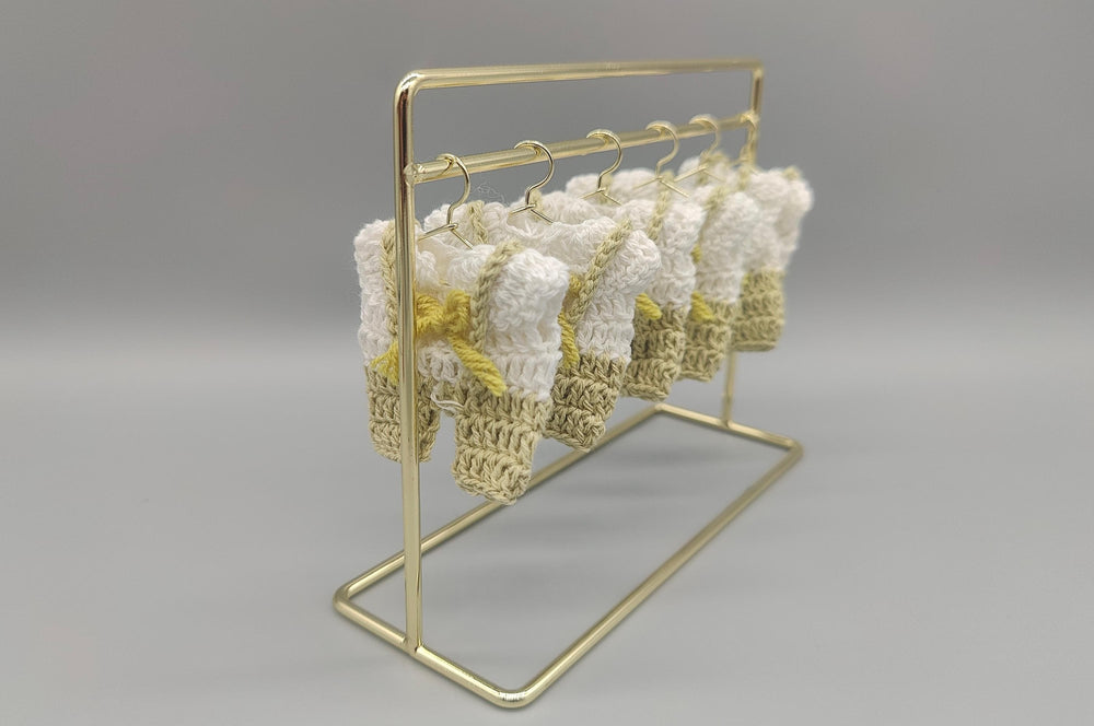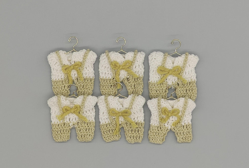 We know every celebration is unique, so we've created several options to perfectly fit your special day. Choose your perfect party favors! 💚 Set of 6 Mini Outfits: A simple yet charming set of six mini crochet overalls, perfect for scatter on a table or to add a sweet touch to any gift bag. 💚 Set of 6 with Mini Hangers: Each adorable outfit comes with its own tiny gold hanger, making them easy to display as mini decorations or hang on a small clothesline. So cute! 💚 Set of 6 with Hangers & Hanging Rack: Our most popular option! Each favor comes with its own mini gold hanger, and all six are presented on a mini hanging rack. This creates a stunning centerpiece or display that your guests will love.