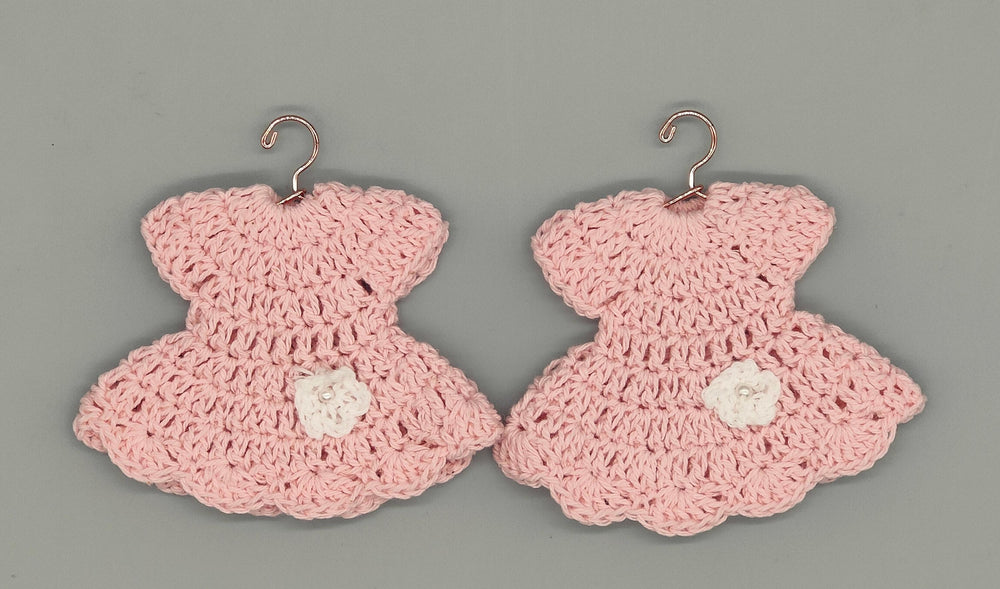 Our baby pink color crochet mini dress is perfect for any baby occasion, quinceanera or communion party. A cute pink dress with flower accent and a pearly bead in the center. Also available with the option to purchase with cute mini-hangers, available in gold, silver, or rose gold.