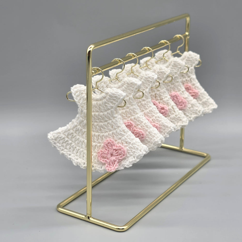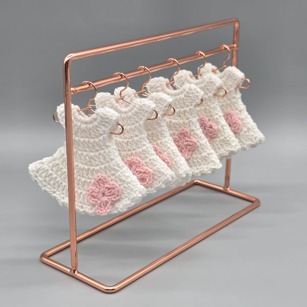Available to purchase as 6 dresses only, or your choice of either gold or rose gold hangers and the optoin to add a hanging rack. Elevate your event with these super cute and chic favors!