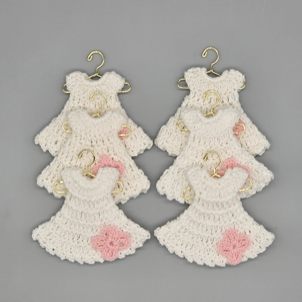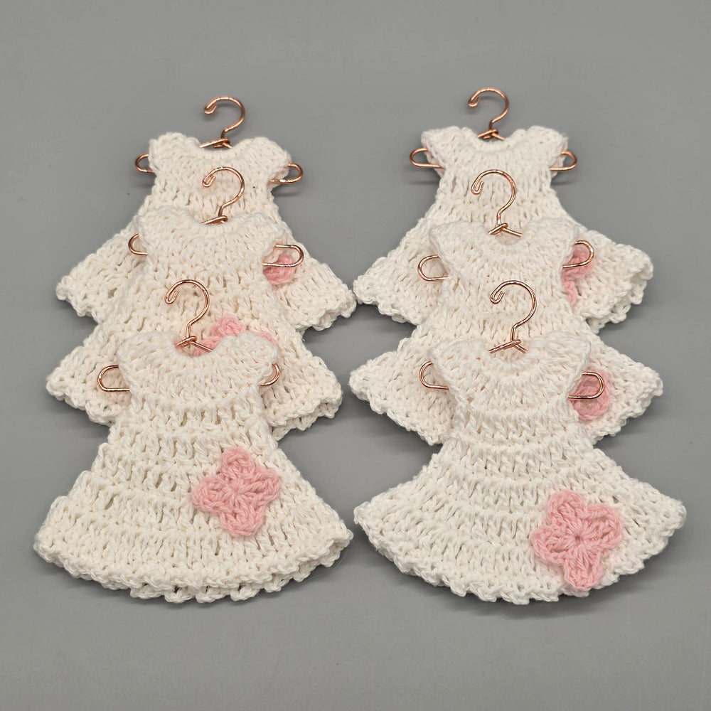 Set of 6 - White crochet Baby Dress with Pink Flower, Baby shower favors, Baby Pink, Baby welcome, Crochet mini dress, quinceanera communion